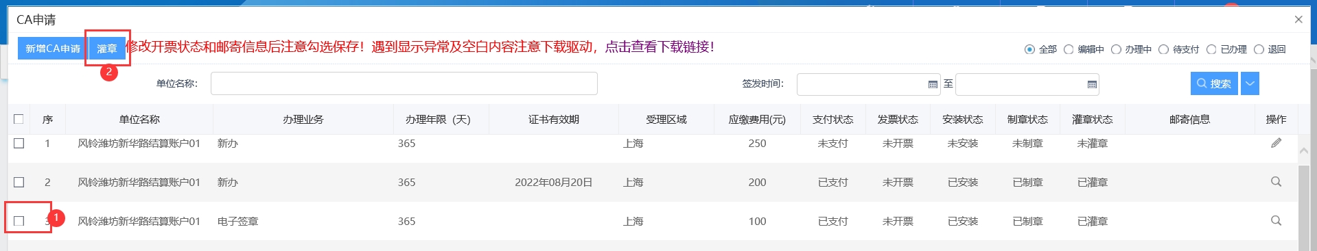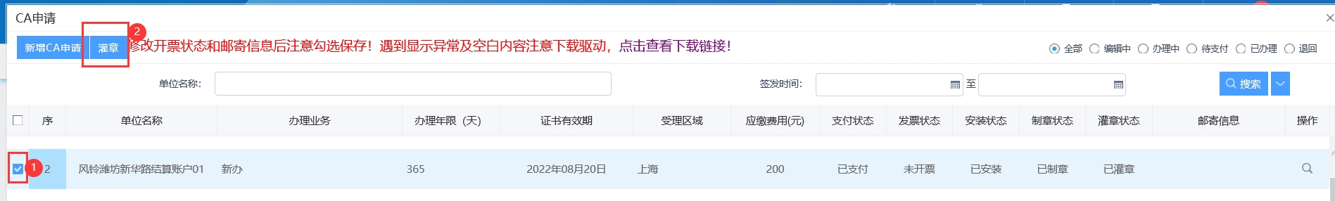 锁进行灌章。(必须为已完成制章续签申请数据方可进行灌章操作)
