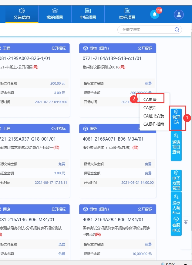 用户登录宝华智慧招标共享平台,点击右侧“管理CA”- “CA申请”,如图: