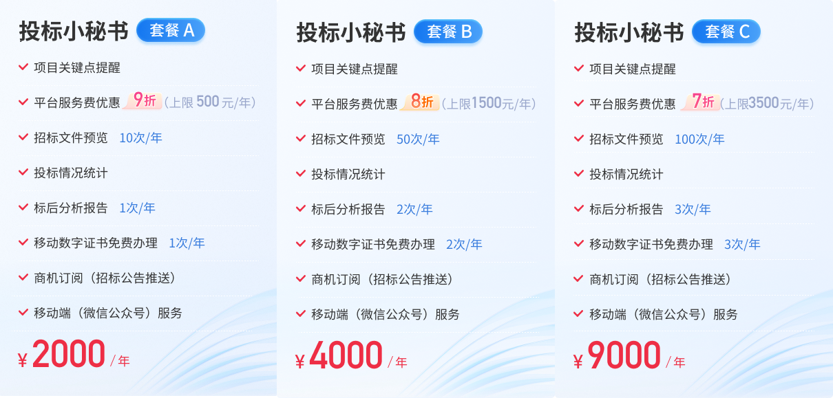 宝华智慧招标平台投标人增值服务产品投标小秘书功能已经于2024年7月12日正式上线,我们期待您的关注。增值服务致力于更加便捷辅助您的投标活动、优惠您的投标成本,内容包括:项目动态提醒、平台使用费优惠、招标文件预览、投标情况统计、标后分析报告、移动证书免费办续、商机订阅(招标公告推送)、微信公众号服务等。投标人可根据需要自愿选择以下套餐购买,具体服务内容描述及办理流程参见操作手册。